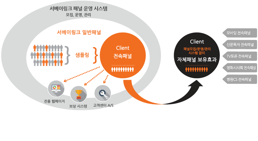 고객 전속 패널은 서베이링크 "Panel In Panel" 개념으로, 서베이링크 회원 중 Sampling하여 적정한 인원을 구성하며, 서베이링크 일반패널에게 적용하는 패널관리 정책 및 서비스를 동일하게 적용 받습니다.